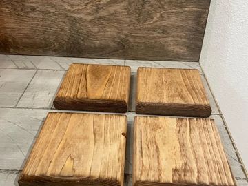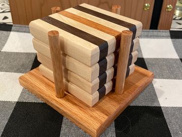 Homemade wood coasters. These beautiful clear stained wood coasters are great for your home or as a gift! The coasters measure 3.25”x3.25”x3/4” thick. Visit our Etsy shop to see purchase options. It will come with the option to buy 1-4 coasters and the option to buy the holder which measures 4.75”x4”75x3.5” tall. The coasters are made using walnut, maple and cherry. The holder is made using Oak.